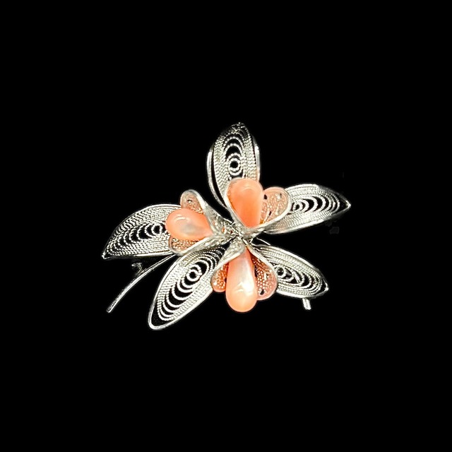 Eternal Bloom Vintage Filigree Flower Brooch with Coral Petals| シルバー ブローチ アクセサリー ヴィンテージ アンティーク 古着