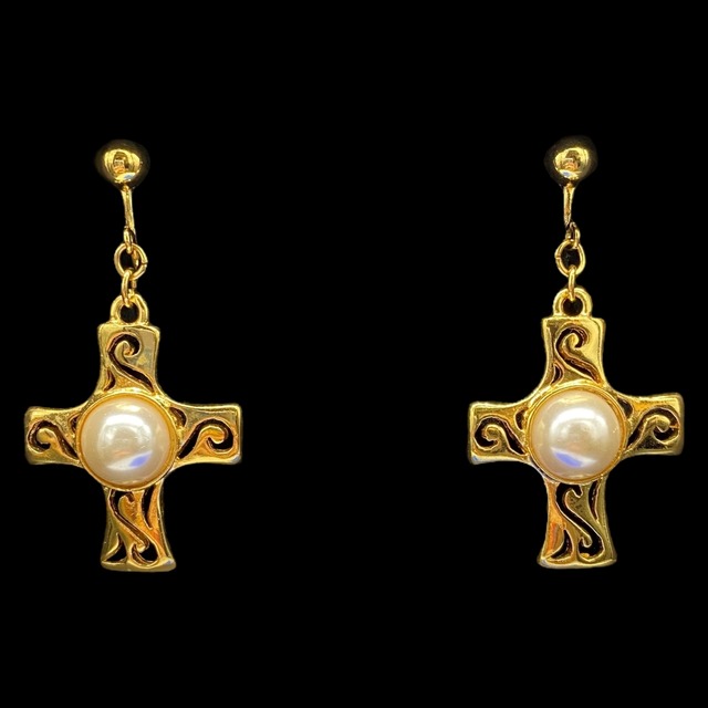 Baroque Cross Pearl Drop Earrings| ゴールド イヤリング アクセサリー ヴィンテージ アンティーク 古着