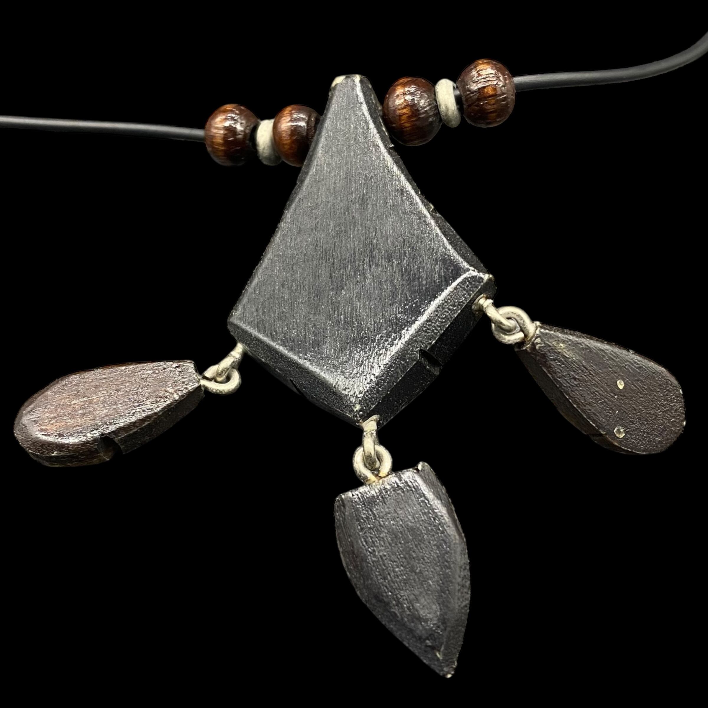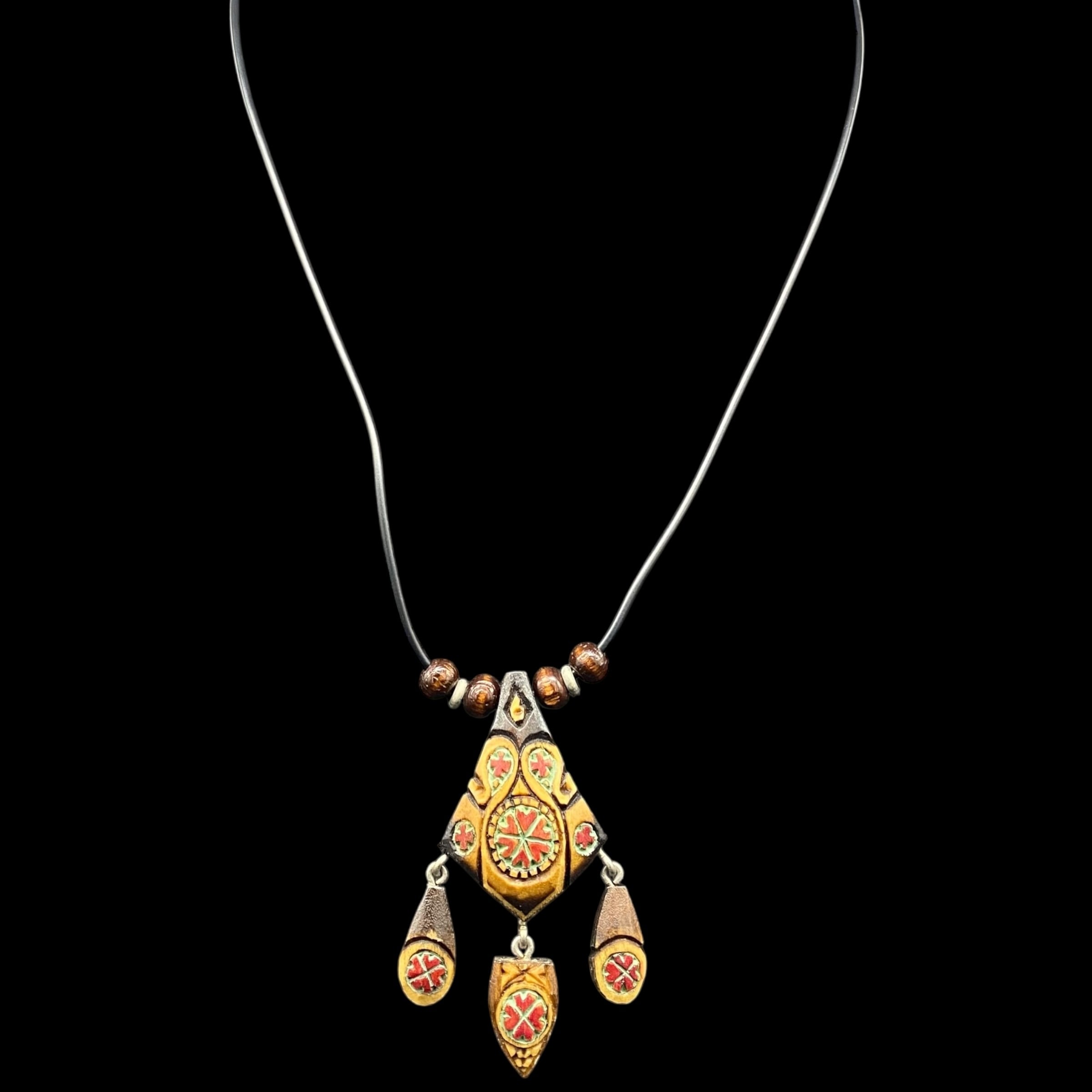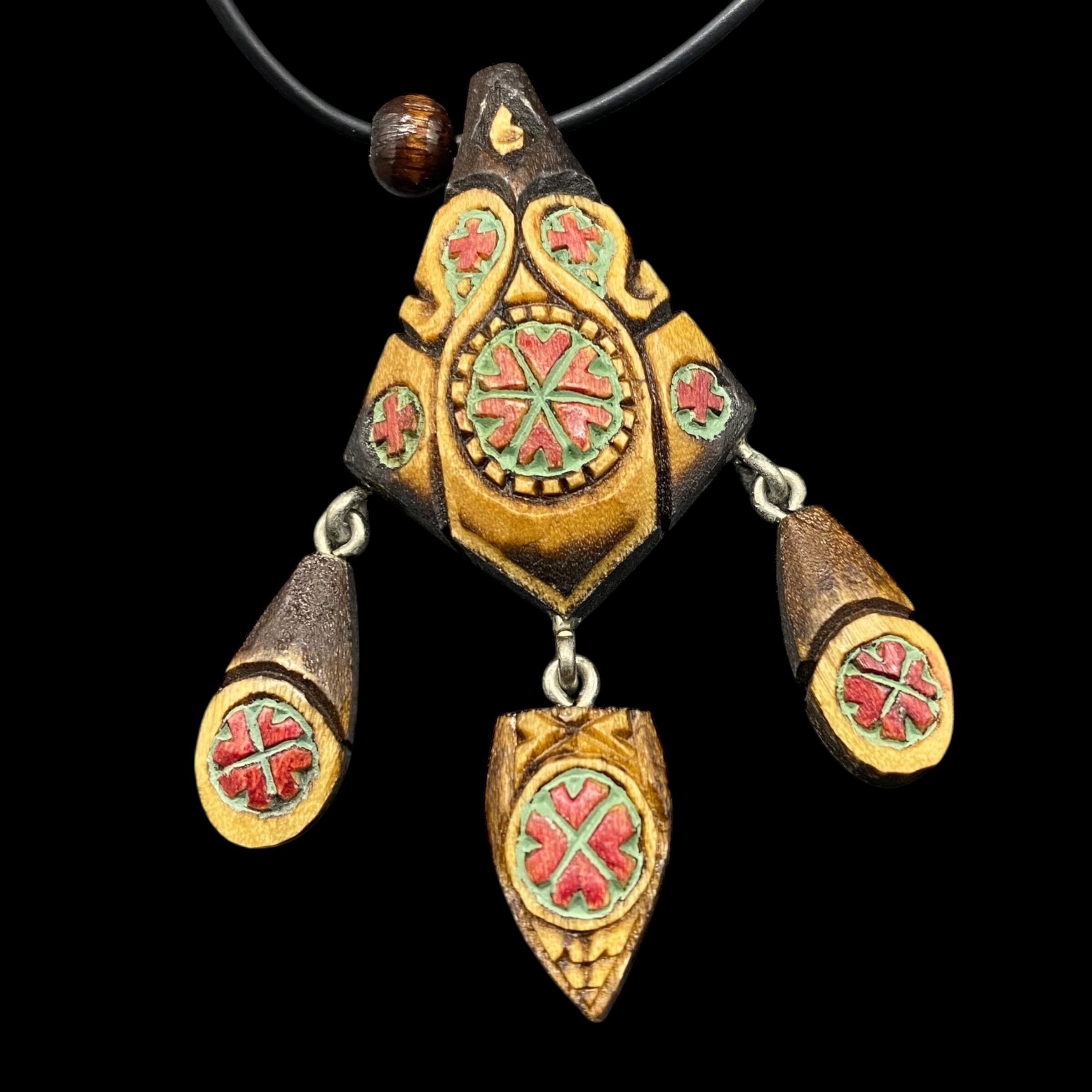 木製のパーツに彫り込まれた幾何学模様はまるで古代の民族装飾を想わせ手仕事の温かみを感じさせます。