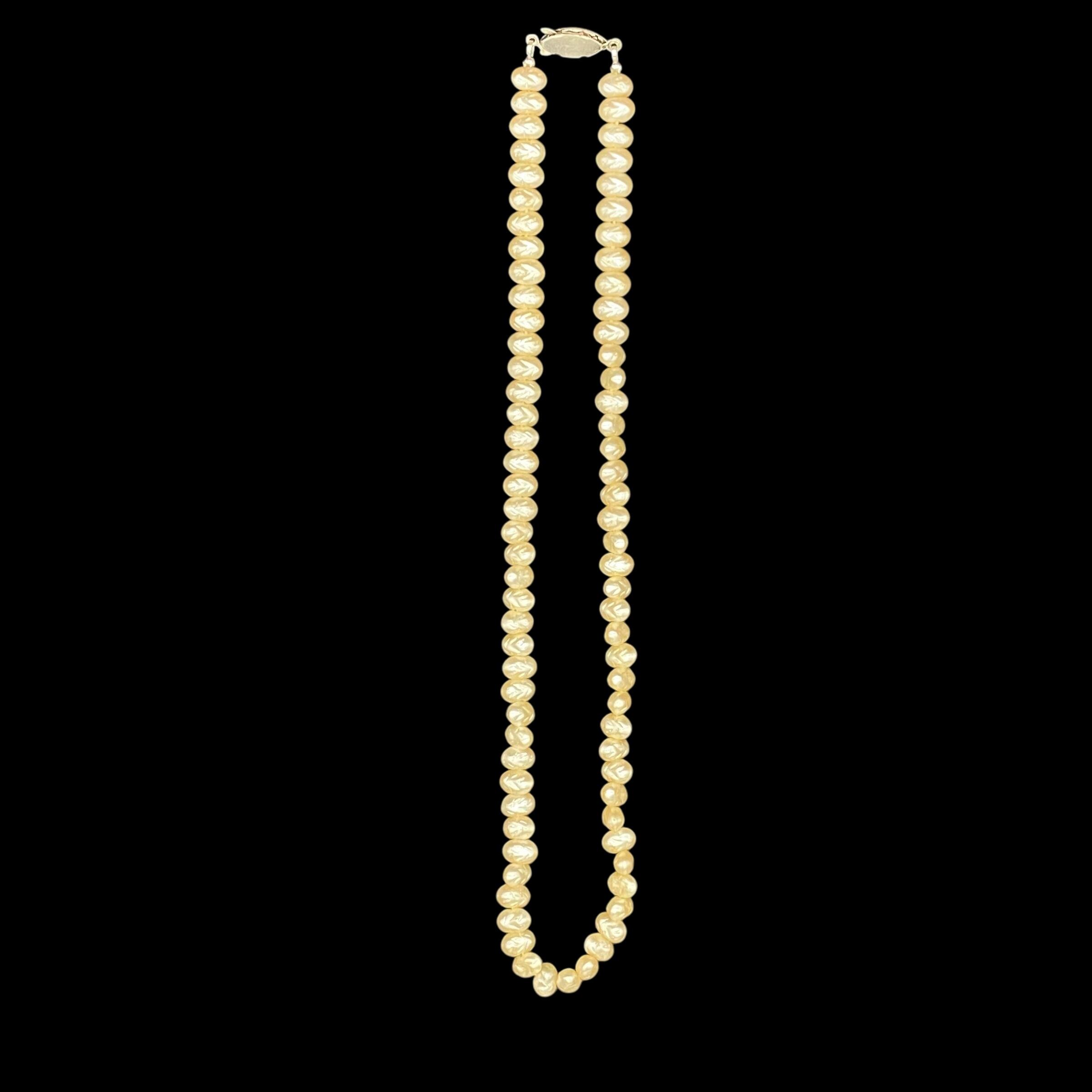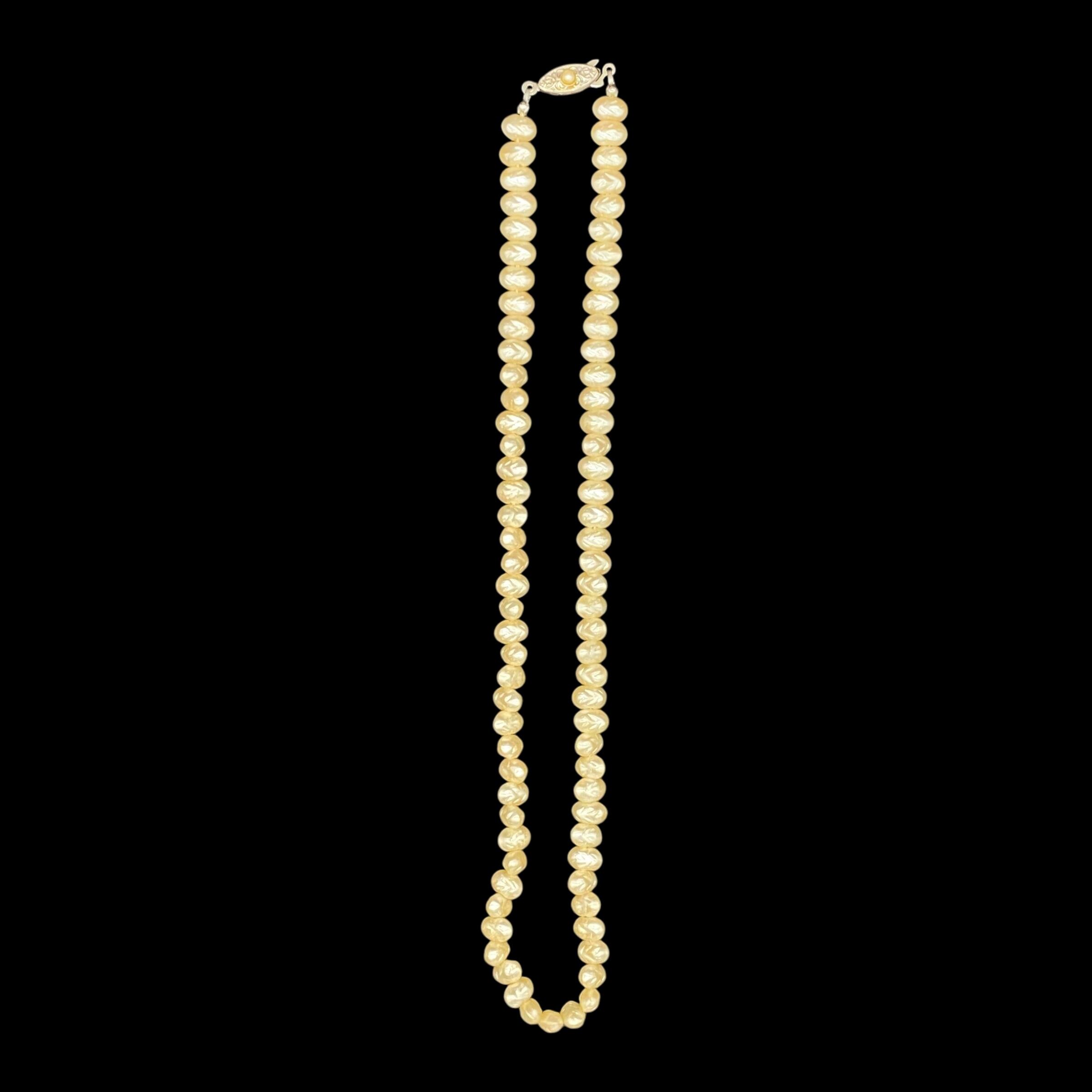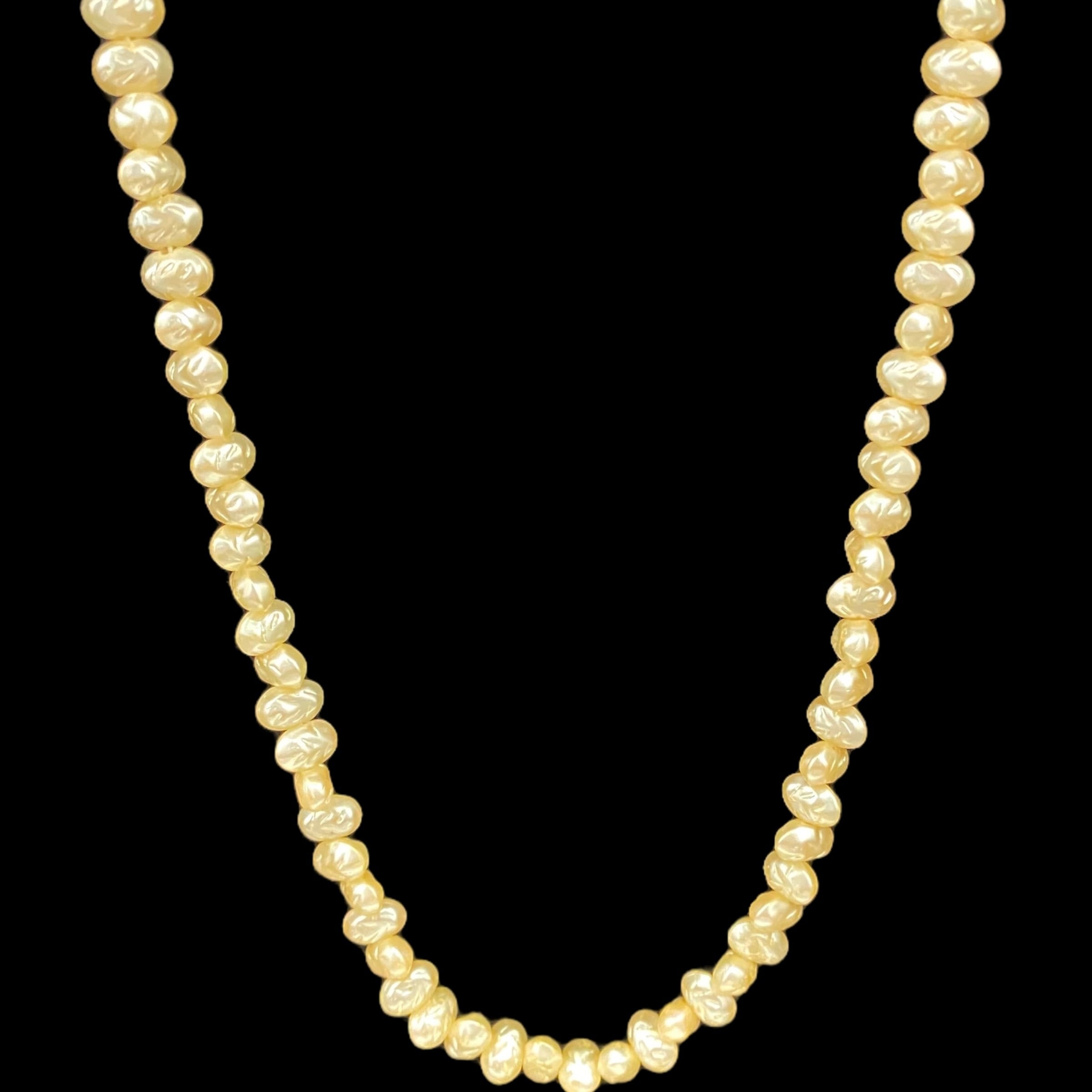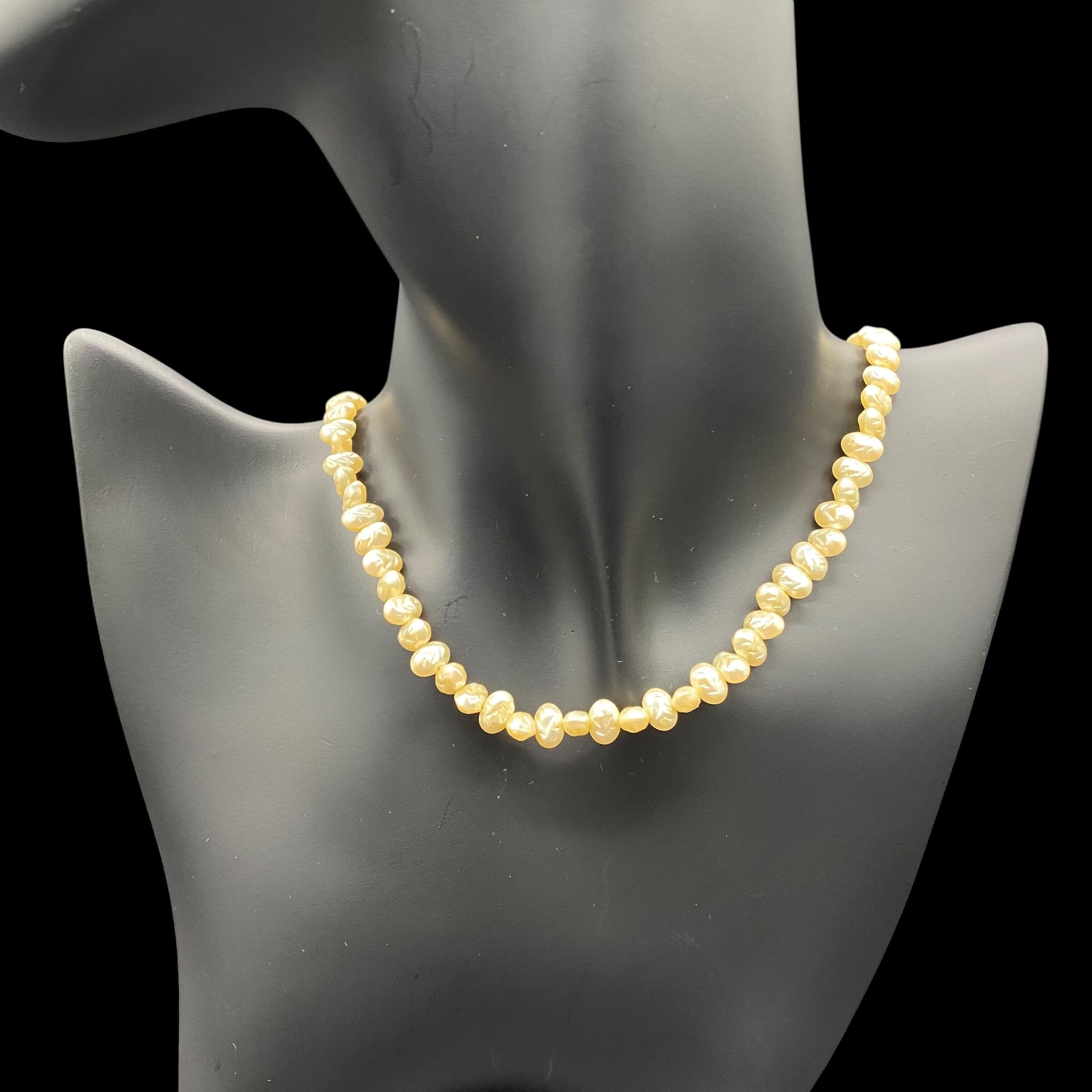 柔らかな光を放つクリームがかったアイボリーカラーのビーズが首元を上品に彩るクラシックな淡水パール風ネックレス。