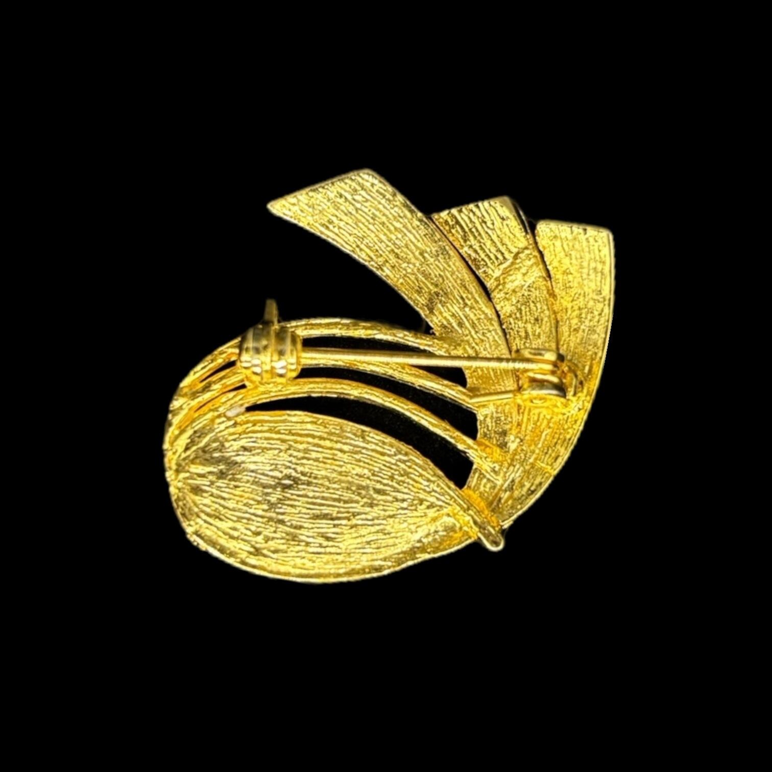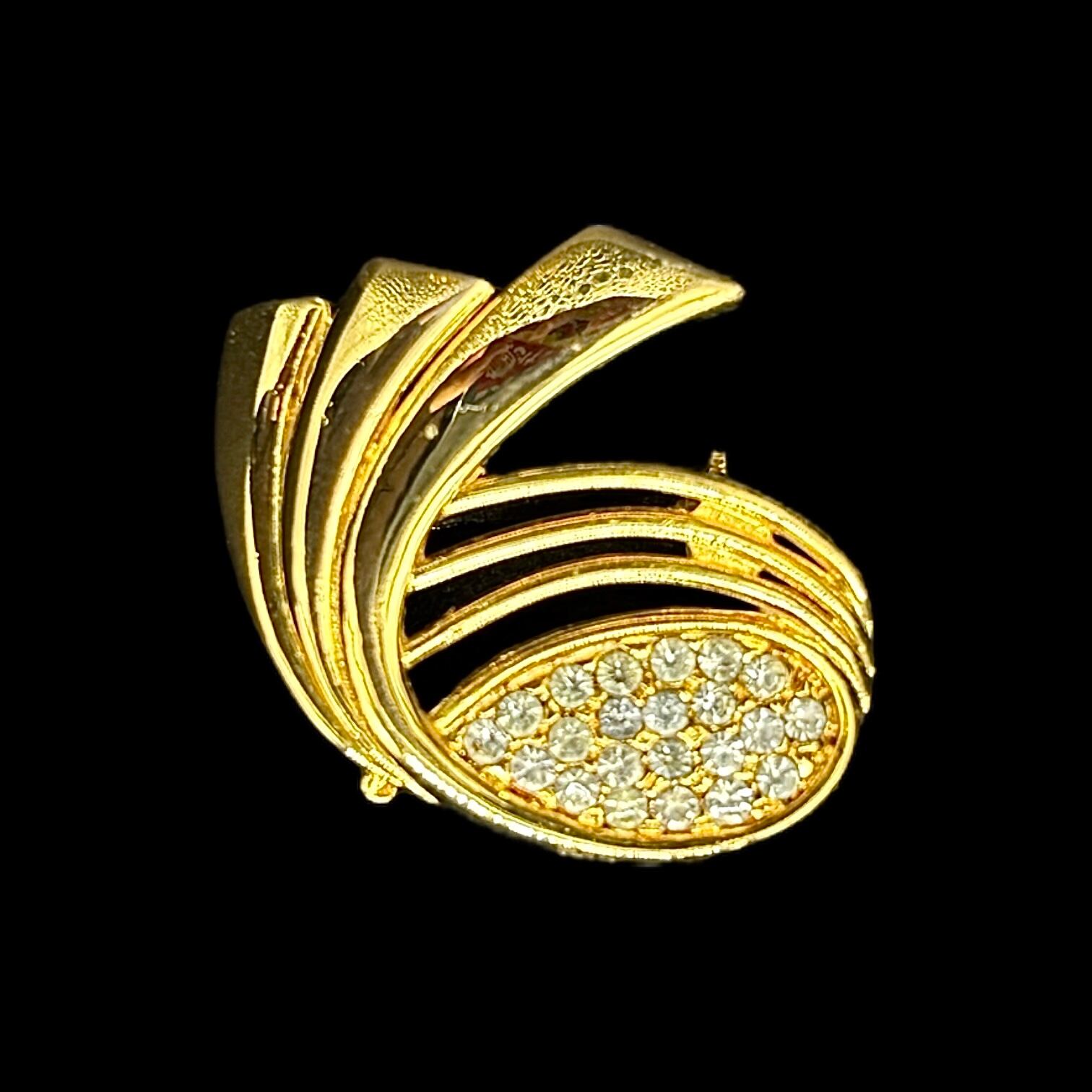 ブローチ中央には、まるで陽光を封じ込めたかのようなクリアストーンが敷き詰められ、ゴールドメタルの曲線美と呼応するように上品な煌めきを放ちます。