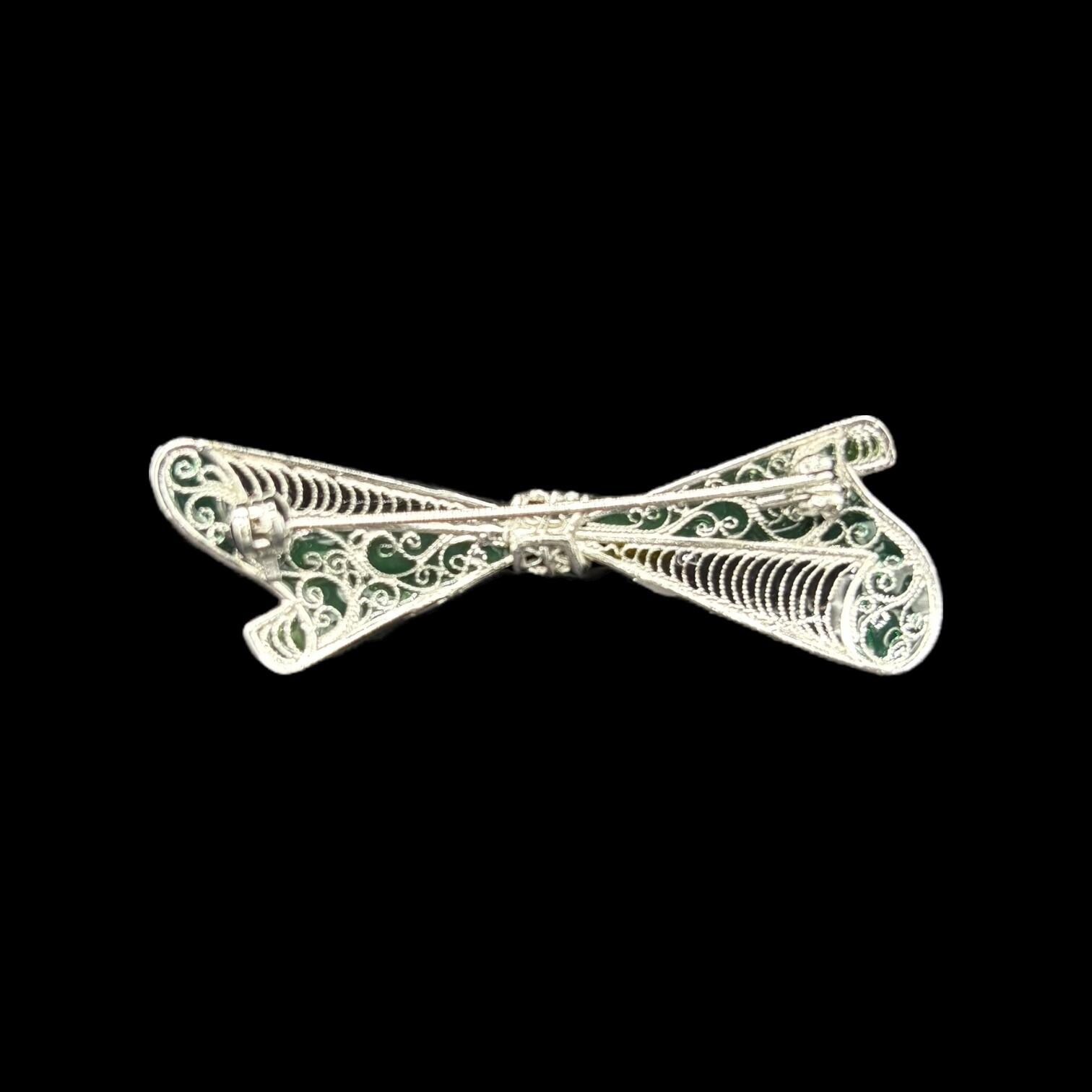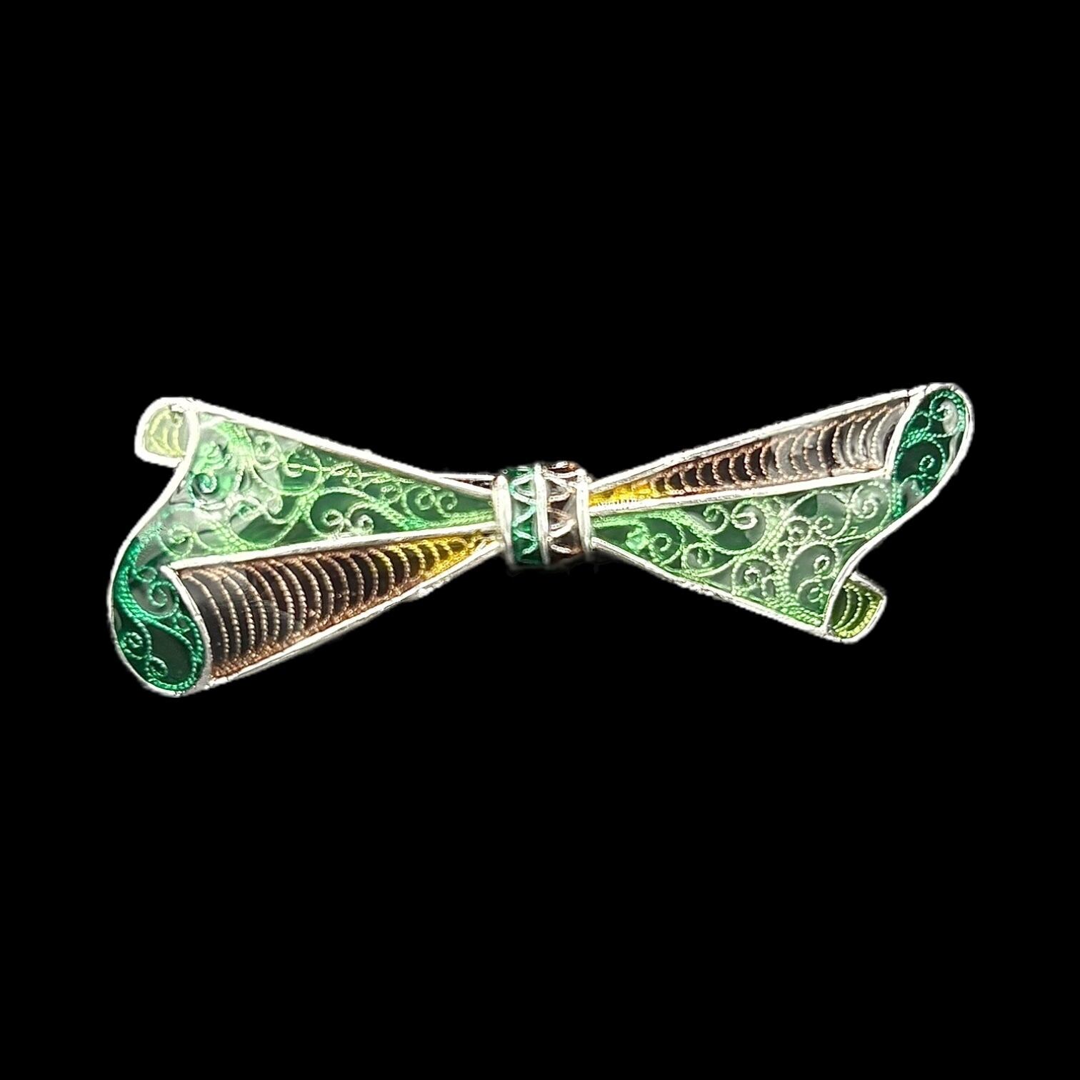 まるで時を超えて届いた贈り物のように、優雅で繊細な印象を漂わせるこちらのヴィンテージブローチは、グリーン〜イエローのグラデーションが織りなす幻想的な色彩と、職人の手仕事によるフィリグリー細工が魅力の一品です。